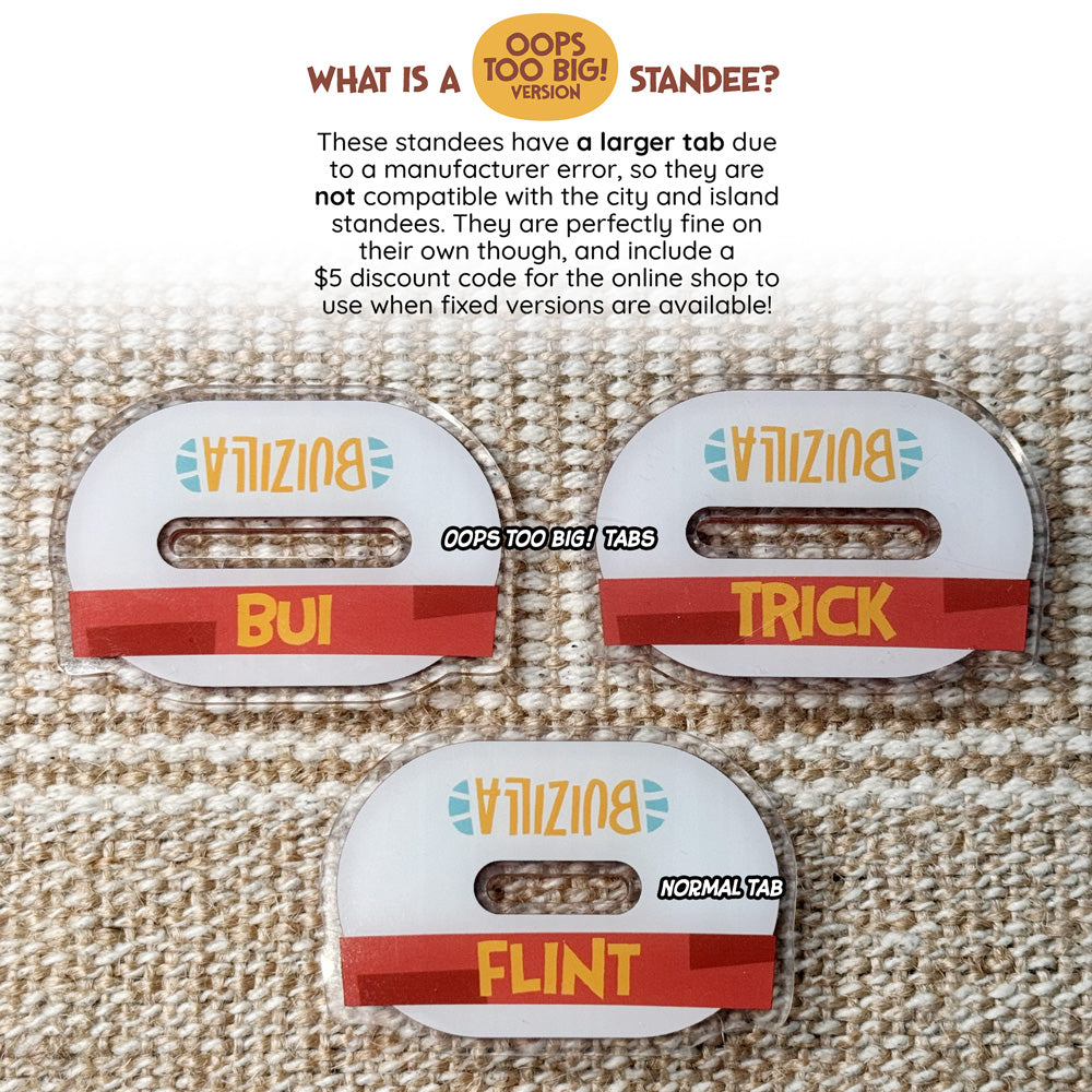 This standee has a manufacturer error where the tab is too big to fit in other smaller standee bases. It's good on its own though, but if you want a fixed version in the future, included is a $5 off coupon code!